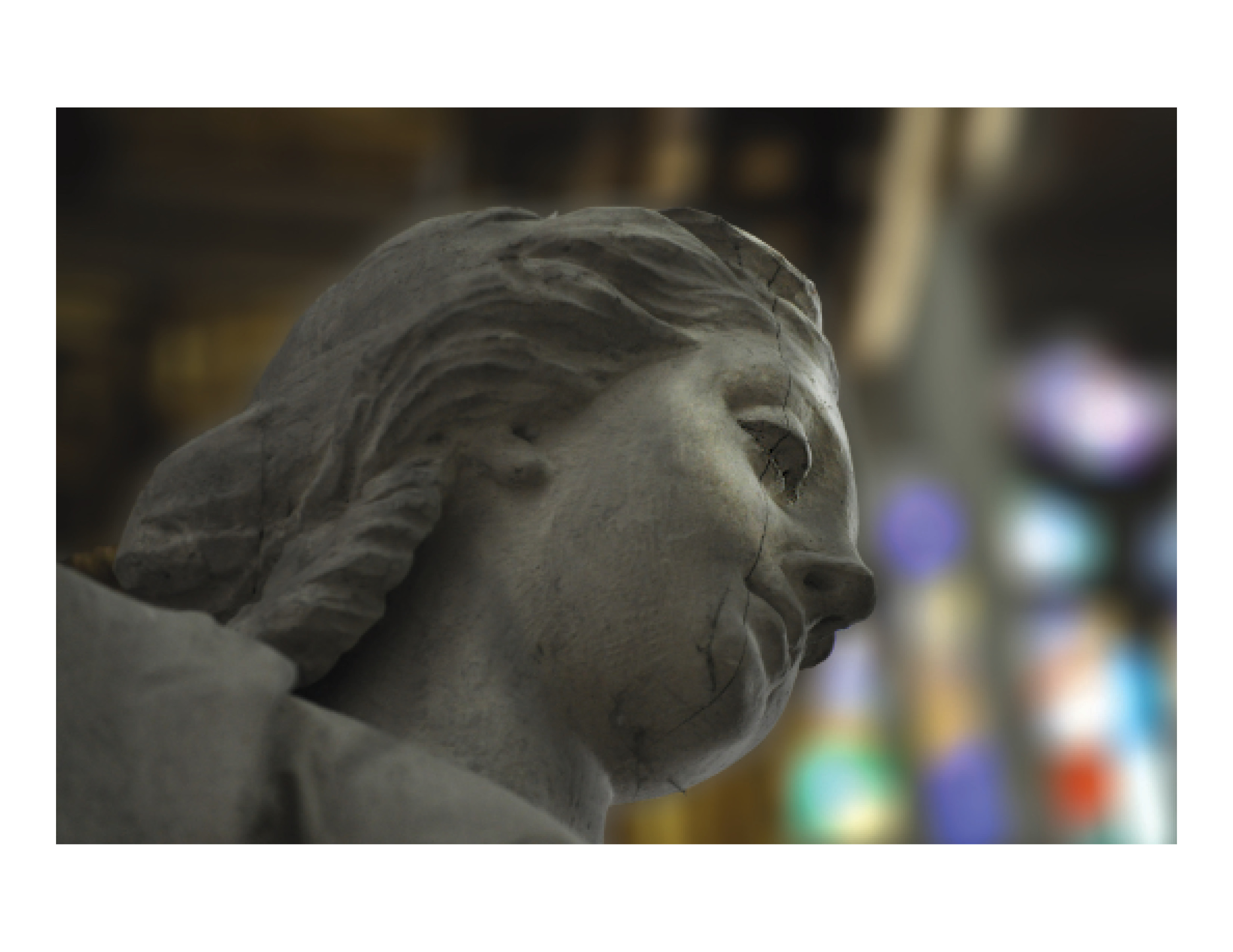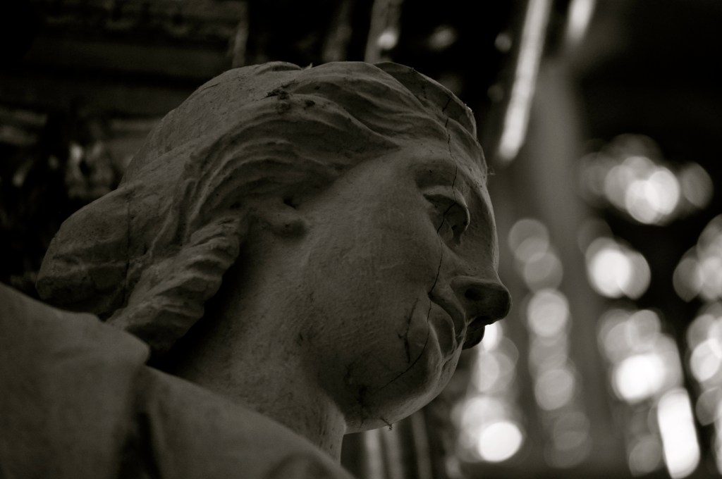 Using Photoshop CS5.5, I used the dodge and burn tools to emphasize her eye and the crack that runs through its centre. I also blurred the background to further emphasize the statue’s face.